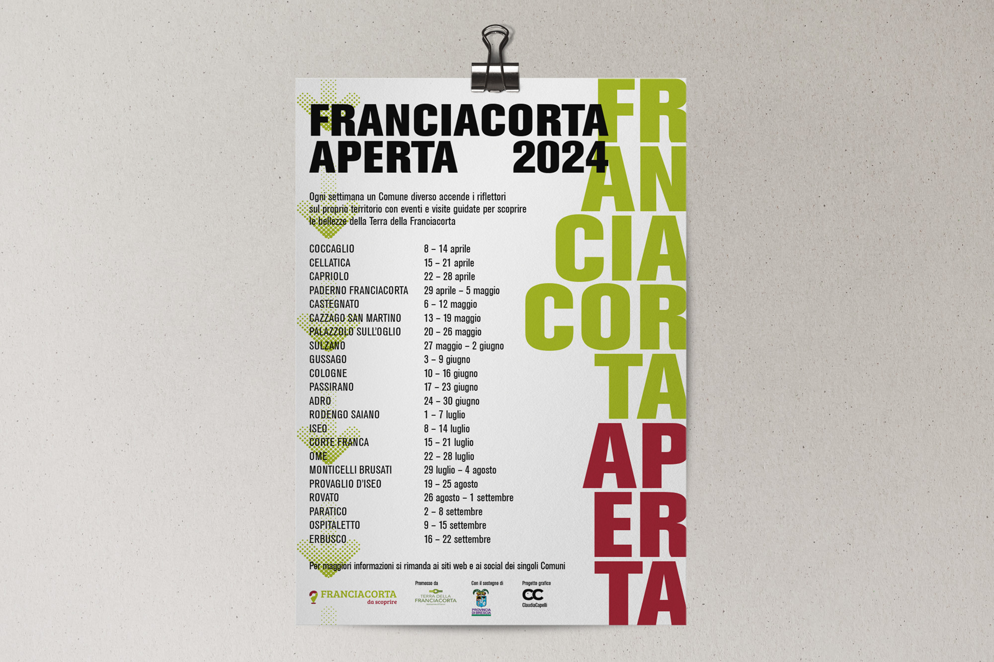 Creazione delle locandine di Franciacorta aperta organizzato da Franciacorta da scoprire, progetto promosso da Associazione Terra della Franciacorta e Strada del Vino Franciacorta che nasce con l’intento di valorizzare il territorio della Franciacorta scoprendone il patrimonio culturale, storico-artistico, architettonico.