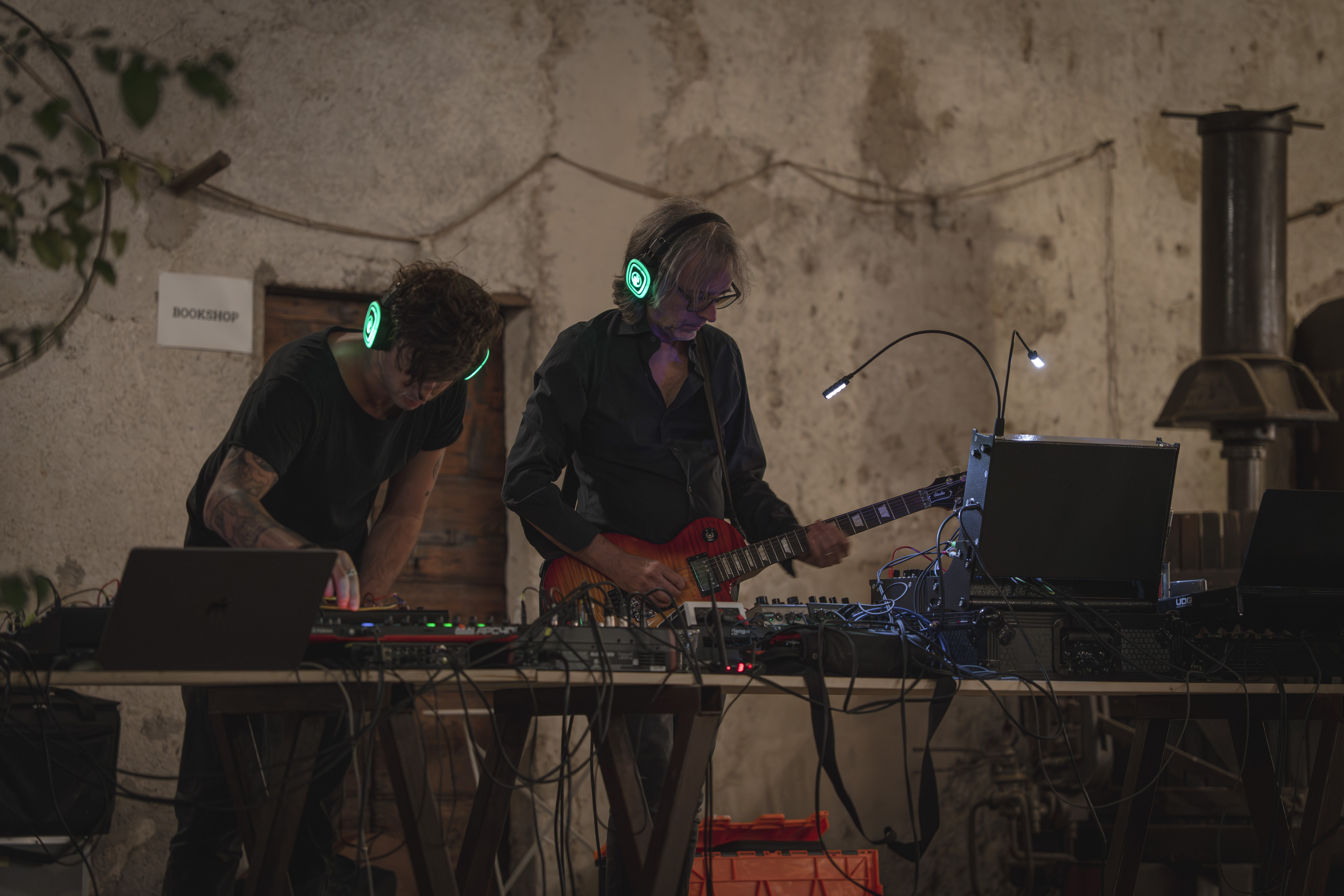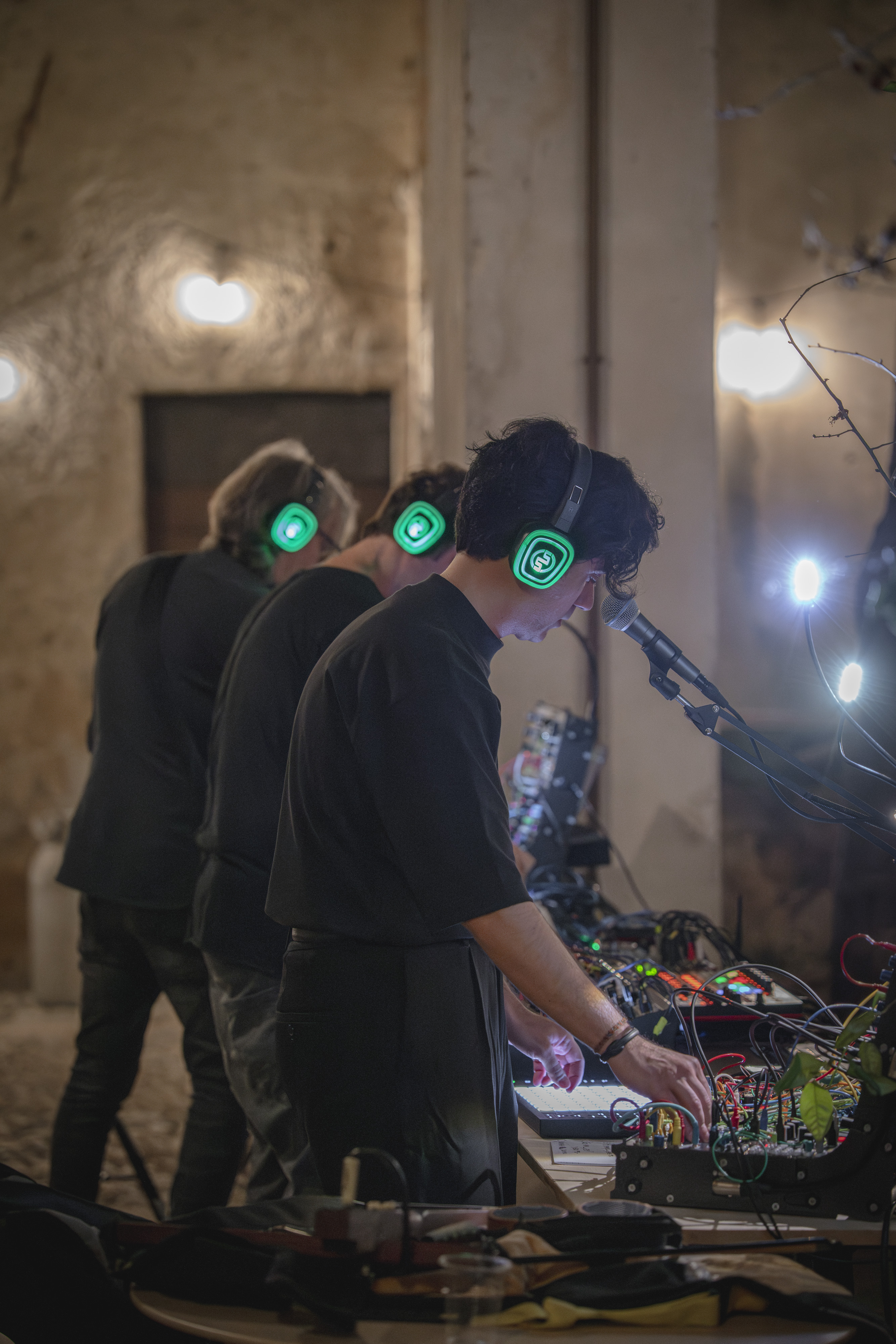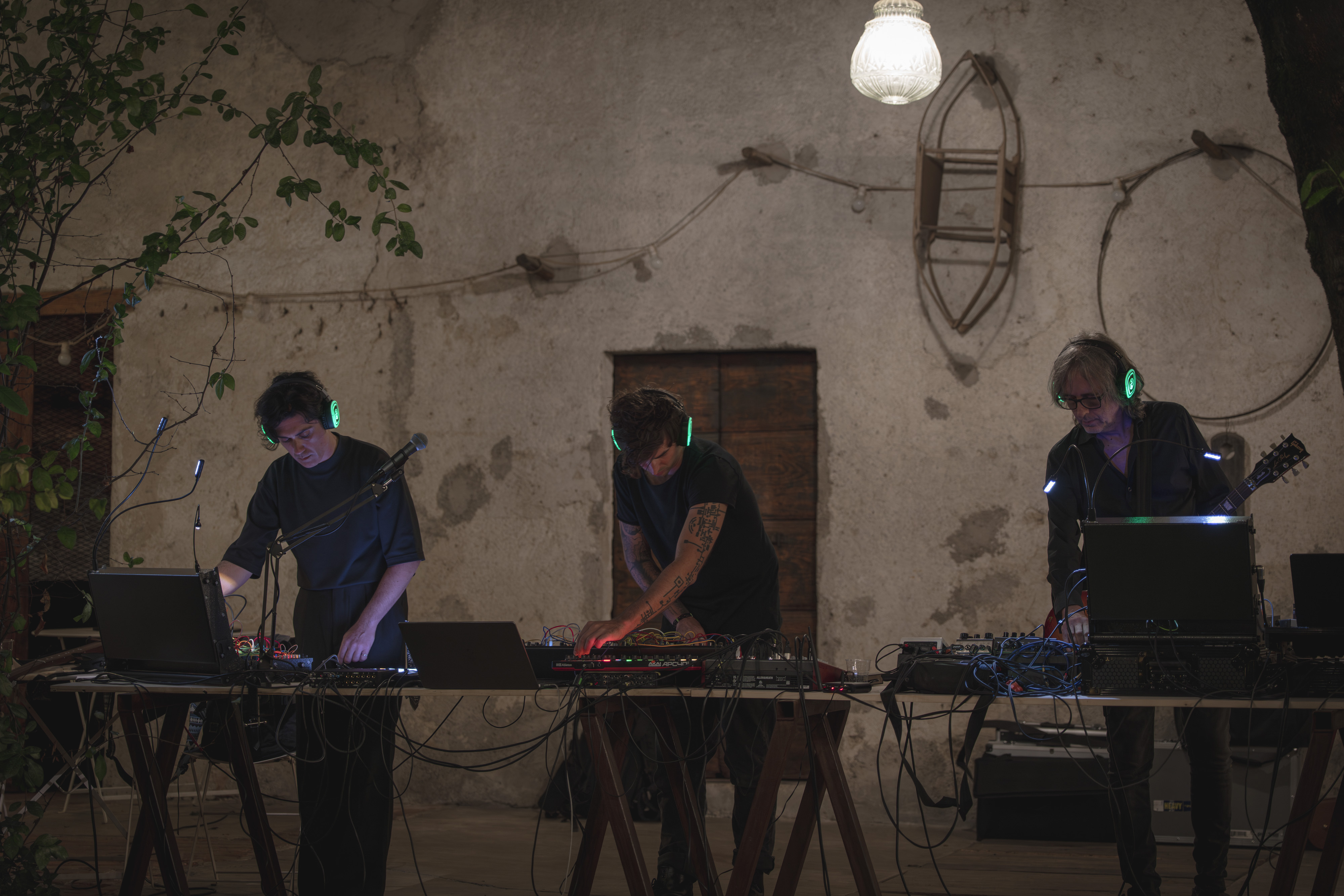 Documentazione della performance live IN ABSENTIA di Hidden Sounds (Riccardo Tesio e Alessio Mosti) + Francesco Fabris. Un universo bellissimo fatto di suoni e rotture e silenzi negli spazi di Leonesia – Fondazione Vittorio Leonesio, Puegnago del Garda.
